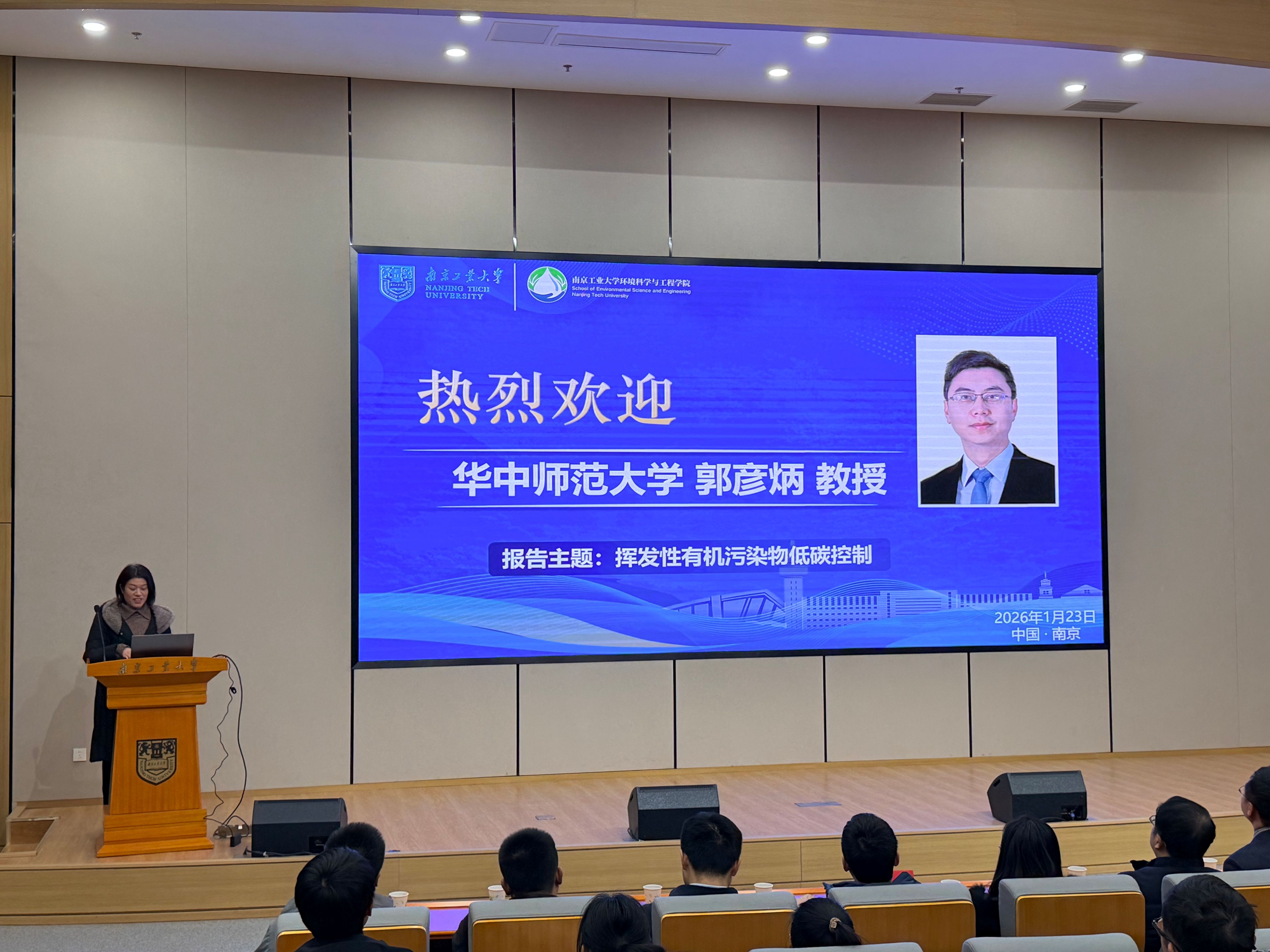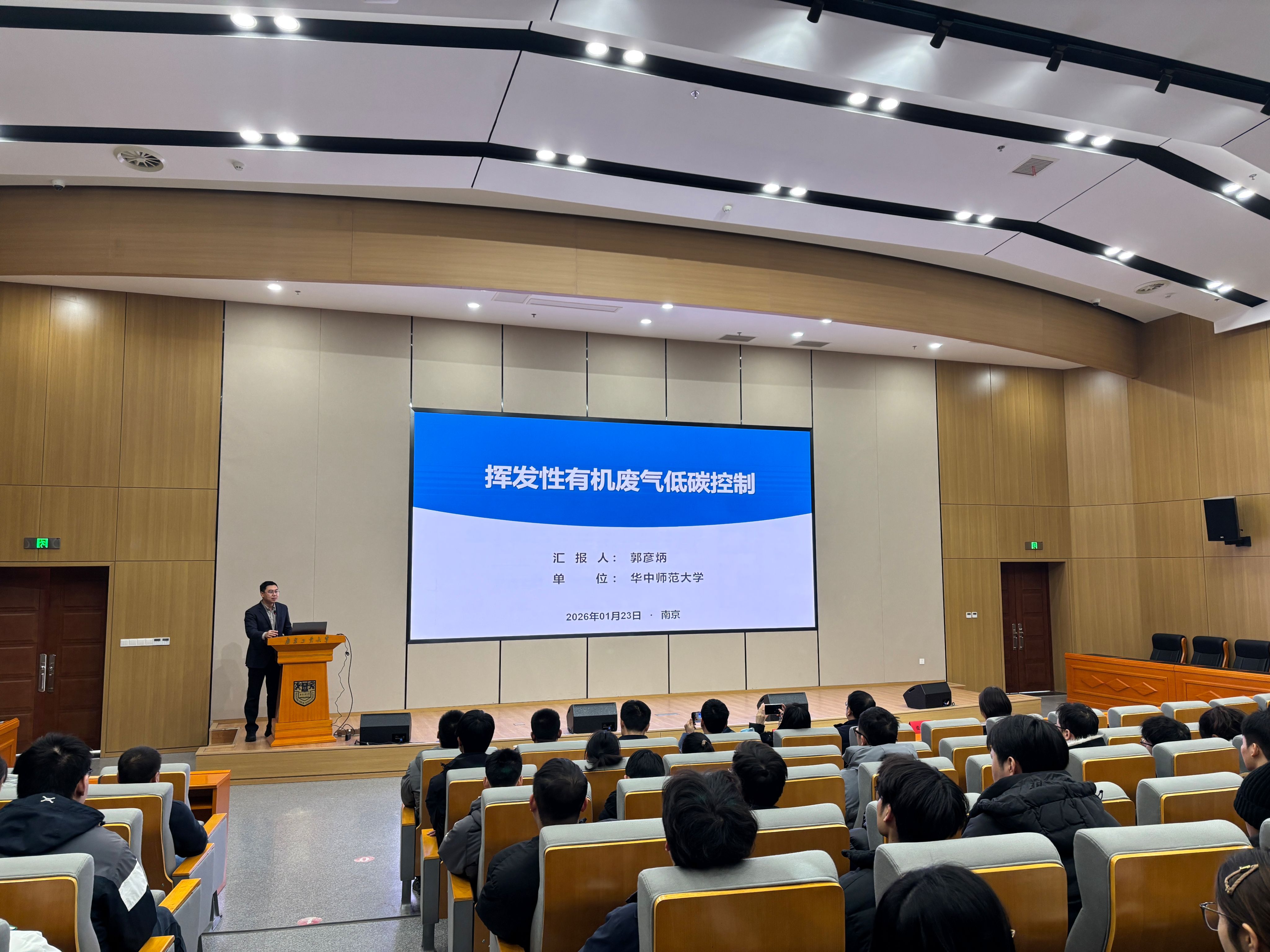 2026年1月23日下午,华中师范大学化学学院郭彦炳教授应邀访问学院,在化学学科楼四楼报告厅作了题为“挥发性有机废气低碳控制”的学术报告。学科建设处处长仲兆祥教授、环境科学与工程学院院长张雪英教授等学院师生代表共120余人参加报告会,报告会由张雪英院长主持。